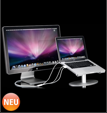 Mac-Accessoires sind schick und teuer – der Xtand Pro von Just Mobile macht hier keine Ausnahme. Aus Aluminium gefertigt und laut Hersteller solide konstruiert, ist der Xtand Pro speziell für die neuen Aluminium-MacBooks konzipiert und gebaut worden. Der Ständer kann in zwei Höhen eingestellt werden. In der niedrigen Version berührt das Notebook mit der Vorderseite beinahe die Schreibtischplatte. Die zweite Höheneinstellung wiederum erinnert doch sehr an die auf ähnlichen Ständern angebrachten Telefone auf Verwaltungsschreibtischen. Nachteil: In beiden Höhen ist die Tastatur genau genommen nicht mehr zu bedienen. Der Anschluss einer zusätzlichen externen Tastatur ist fast unabdingbar.
