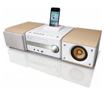 Die als „Wood Cone“ bezeichneten Membranen bringen es auf einen Durchmesser von jeweils acht Zentimetern. Die beiden Treiber - es handelt sich um 1-Wege-Boxen - wurden mit 4-lagigen Schwingspulen bestückt und haben eine Impedanz von vier Ohm. Ob die 15,5 Zentimeter breiten, 12,2 Zentimeter hohen und 23,6 Zentimeter tiefen Gehäuse ebenfalls aus echtem Holz bestehen, erfährt man leider nicht. Sicher ist: Der Verstärker belastet die Schallwandler mit einer RMS-Augangsleistung von 2 x 20 Watt. Mit separaten Reglern für Bässe und Höhen lässt sich der Klang weiter optimieren. Die Musik kommt entweder vom RDS-fähigen Tuner (30 Speicherplätze für FM-, 15 weitere für AM-Sender), sie wird über das optische Laufwerk von einer Audio-, MP3- oder WMA-CD, von einem iPod, einem iPhone oder einem USB-Speicher abgespielt. Den Apple-Player platziert man oben auf dem Gehäuse und steuert ihn komfortabel mit der Fernbedienung, gleichzeitig wird der Akku mit neuer Energie versorgt. Die USB-Schnittstelle befindet sich an der Vorderseite. Sie bietet eine Ausgangsspannung von fünf Volt und soll USB-Geräte auslesen können, die mit FAT16 oder FAT32 formatiert wurden. Ein Aux-Eingang und ein Kopfhöreranschluss, ein 75-Ohm-Antenneneingang, ein Composite-Video-Ausgang, über den man Fotos und Filme vom iPod / vom iPhone am Fernseher anschauen kann und natürlich die farblich markierten Lautsprecherklemmen runden die Anschlussleiste ab.