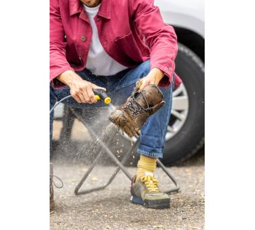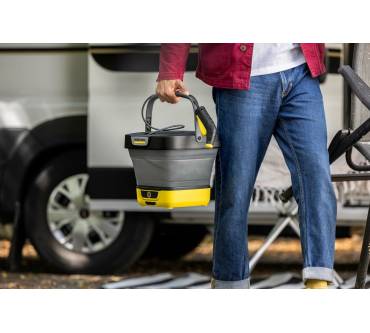 Beim Kärcher OC 3 Foldable handelt es sich um einen Reinigungshelfer für unterwegs. Der Niederdruckreiniger mit 0,5 bar eignet sich dabei für frische Verschmutzungen. Dank des faltbaren Wassertanks lässt sich das Gerät auf nur 11 Zentimeter Höhe zusammenstauchen und so platzsparend aufbewahren. Ungünstigerweise fehlt ein dicht verschließender Deckel. Zapfen Sie Wasser entweder am Einsatzort oder führen Sie es in einem separaten Behälter mit. Der Wassertank fasst beachtliche acht Liter. Der Druckschlauch ist mit 1,8 Metern ausreichend lang, sodass Sie flexibel bleiben. Der Reinigungshelfer ist akkubetrieben mit einem Lithium-Ionen-Akku, den Sie an einer Powerbank aufladen können. Die Akkustandanzeige informiert Sie, wann es Zeit zum Laden ist. Enttäuschenderweise muss der Akku bei einer Laufzeit von maximal 15 Minuten mehr als zwei Stunden aufladen.