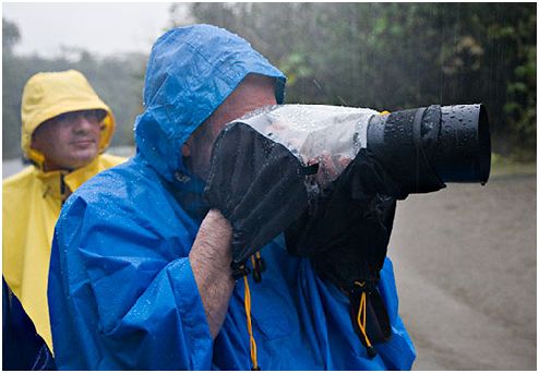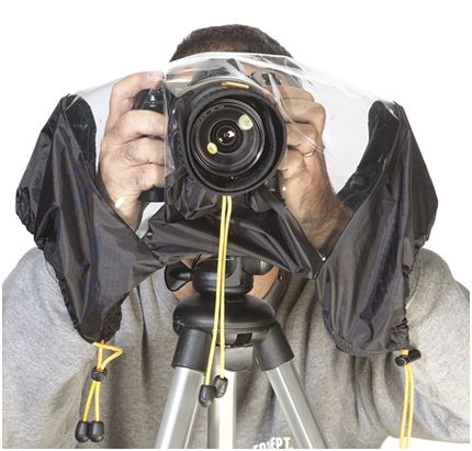 Bei schlechtem Wetter müssen Fotografen nicht zu Hause bleiben – sie können ihre Spiegelreflexkameras auch mit einem Kata Element Cover E-702 vor Nässe schützen. Dieser Klarsicht-Kunststoffbeutel eignet sich für Objektive bis zu einer Brennweite von 200 Millimetern. Wer größere Objektive benutzen möchte, kann das entsprechende Zubehör zum Element Cover E-702 kaufen. Die Hülle weist eine Öffnung mit Reißverschluss unten auf, durch die der Fotograf seinen Hände oder den Kopf eines Stativs stecken kann. Seitlich befinden sich ebenfalls zwei Eingriffslöcher. Das Objektiv wird durch eine Art Stulpe geschützt, an der sich eine Manschette mit Klettverschluss befindet. Sie kann gleichzeitig als Sonnenblende genutzt werden – falls der Regen einmal aussetzt. Die seitlichen Eingriffe als auch die Objektivstulpe werden mit Kordelzügen verschlossen. Eine Öffnung für den Kameragurt kann das Element Cover E-702 nicht vorweisen.