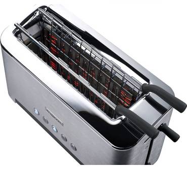 Die Röstkammer – der Kenwood besitzt nur eine einzige, woraus sich übrigens, um dies gleich zu erwähnen, auch eine Breite des Geräts von lediglich rund 15 Zentimetern ergibt – kann in sechs Stufen von minimal einem auf maximal sechs Zentimeter verbreitert werden. Selbst Brötchen lassen sich daher in der Kammer rösten, auf einen zusätzlichen Brötchenaufsatz kann der Kenwood deshalb getrost verzichten. Für Bagels wiederum, die hierzulande immer beliebter werden, kann ein Teil der Heizelemente abgeschaltet werden, damit diese stilecht einseitig geröstet werden können. Ferner kann während des Toastens ein Blick auf den Fortschritt des Rostvorgangs geworfen werden, und zwar ohne, dass der Vorgang selbst abgebrochen wird und anschließend von vorne wieder startet, wie dies normalerweise der Fall ist. Diese Funktion nennt sich „Peek & View“ und ist natürlich speziell bei dickem Toastgut von großem Vorteil, bei dem erfahrungsgemäß mit den Bräunungsstufen etwas herumexperimentiert werden muss. Die Krümelschublade wiederum öffnet sich auf einen leichten Antipper mit dem Finger ganz von alleine, fummeliges Geziehe und Geschiebe gehören hier der Vergangenheit an. Aufwärmen und Auftauen kann der Toaster natürlich auch, vom Über-/Ausbacken belegter Sandwiches dank mitgelieferter Zange war anfangs schon die Rede.