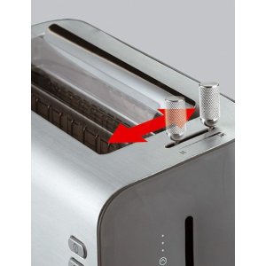 Für halbe Brötchen jedoch oder auch für dickere Brotscheiben ist die Verstellmöglichkeit sehr praktisch und sinnvoll. Und da es in diesen Fällen häufig vorkommt, dass man während des Toastens gerne den bereits erreichten Bräunungsgrad überprüfen möchte, kann das Toatsgut mit der Peek & View genannten Funktion kurz angehoben werden, ohne dass deshalb der Toaster sich ausschaltet – eine pfiffige Idee, die sich Kenwood da hat einfallen lassen.