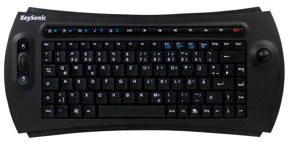 Mit dem recht großen Trackball (19 Millimeter Durchmesser) an der rechten Seite, zwei Maustasten auf der linken sowie je eine an der Unterseite der Tastatur (links/rechts) macht die KSK-5200 RFM von KeySonic eine separate Maus im Multimedia-Einsatz von der Couch aus nahezu überflüssig. Die Couch darf dabei die Standardentfernung von zehn Metern zum PC einnehmen, ohne dass der Funkkontakt abbricht. Eine vollwertige Tastatur mit „normaler Tastengröße“ (KeySonic) garantiert darüber hinaus den von einer Schreibtisch-Tastatur her gewohnten Tippkomfort.