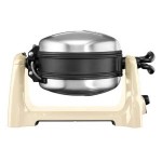 „Super teuer, schwer. Doppeleisen für sehr dicke Waffeln, drehbar. Netzschalter, Akustiksignal, Timer (maximal 5,5 Minuten). Backt gut, sehr gleichmäßig, braucht viel Strom. Bei starker Verschmutzung schlecht zu reinigen.“