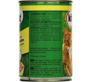 Das Dosen-Nassfutter von Kitekat überzeugt durch seinen Preis und die Nährstoffkombination. Ihre Katze wird mit diesem Produkt gesund ernährt, ohne das ein Mangel oder eine schädliche Überdosierung hervorgerufen werden. Es ist das einzige Markenfutter mit knapp sehr gutem Qualitätsurteil der Stiftung Warentest im aktuellen Vergleichstest (5/2020). Die Fütterungsempfehlungen sind soweit auch solide, allerdings müssen Sie die Hinweise hochrechnen, wenn Sie eine leichtere oder schwerere Katze als mit 4 Kilogramm haben.