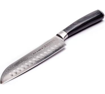 Mit diesem Santokumesser von Klamer führen Sie selbst sehr feine Schnitte präzise aus bzw. können nicht nur japanische Gerichte flott vorbereiten. Durch den Schliff mit Kullen bleiben Karotte, Gurke & Co. nicht an der Klinge kleben und das Ergebnis wird präzise, beispielsweise für Dekorationen. 67 Lagen japanischer Stahl mit einer Härte von 61 nach der Rockwell-Skala deuten auf Langlebigkeit hin und eine ausdauernde Schärfe. Dazu ist der Griff aus Pakka-Holz gefertigt und liegt neben der ansprechenden Optik auch griffig in Ihrer Hand. Laut Hersteller ging das Messer in einem neueren Test als Sieger hervor, was durch über 80 Prozent hoher Bewertungen von Nutzern bestätigt wird. Nur vereinzelt berichten Rezensenten von kleineren Schäden an der Klinge bei der Lieferung.