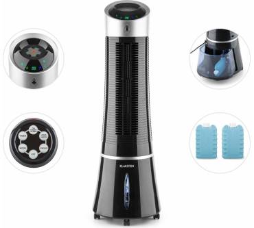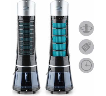 stickige Raumluft in Bewegung zu bringen und etwas aufzufrischen. Der Effekt leichter Abkühlung der Gebläseluft durch eiskaltes Wasser aus dem 6-Liter-Tank spiegelt die Qualität eines guten Verdunstungskühlers wider. Im Prüfpunkt „Kühlung“ gibt es Lob für die mitgelieferten Kühl-Akkus zur Verbesserung des Auffrischungseffekts und ihre Ausdauer von bis zu drei Stunden, bevor sie erneut gefroren werden müssen. Der integrierte Ionisator kann das Empfinden von frischerer Raumluft durchaus verstärken, Intensiv-Gerüche wie Zigarettenrauch bleiben aber in der Luft hängen. Wer Räume messbar herunterkühlen möchte, ist auf ein klassisches Klimagerät angewiesen. Klar, dass von einem mit einem Wassertank aufgerüsteten Ventilator kein messbarer Temperaturunterschied erwartet werden kann.