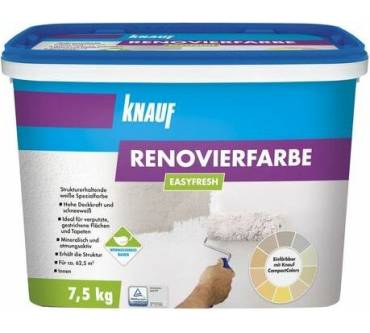 Knauf Easyfresh ist eine mineralische Renovierfarbe, die speziell entwickelt wurde, um bestehende Wand- und Deckenstrukturen zu erhalten und aufzufrischen. Sie eignet sich für verschiedene Untergründe wie mineralische Putze, Dekorputze, Gipskartonplatten, Tapeten und Farbanstriche. Die Farbe zeichnet sich durch hohe Deckkraft und Abriebfestigkeit aus und ist in schneeweiß erhältlich. Sie ist atmungsaktiv und wasserdampfdurchlässig, was zu einem gesunden Raumklima beiträgt. Knauf Easyfresh ist frei von Lösemitteln, Emissionen, Weichmachern und Konservierungsmitteln und entspricht den VOC-Vorgaben. Für individuelle Farbgestaltungen kann die Farbe mit Knauf Compact Colors eingefärbt werden.