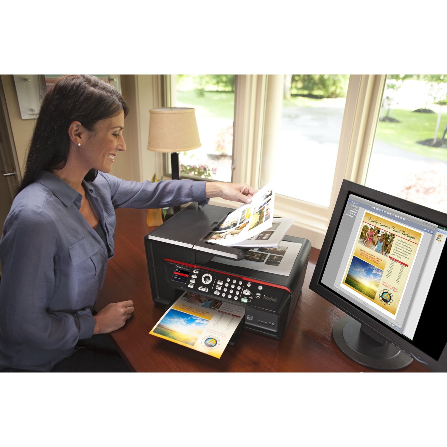Sollen schließlich auch Fotos und Dokumente direkt von einem Smartphone ausgedruckt werden, stellt Kodak eine gesonderte App dazu bereit, die es sowohl für das iPhone als auch für Blackberry- sowie Android-Geräte gibt. Im Büro selbst wiederum lässt der Multifunktionsdrucker keinerlei Wünsche offen, denn der Hersteller hat das Gerät mit nahezu allem ausgestattet, was man sich für einen Bürodrucker eigentlich nur wünschen kann.