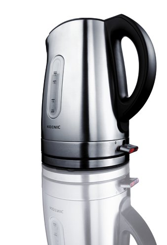 Der zuletzt genannte Aspekt verdient eine kleine Erläuterung. Nicht gerade wenige sogenannte „Edelstahl“-Wasserkocher sind nämlich streng genommen eine „Mogelpackung“. Der Edelstahl beschränkt sich in diesen Fällen auf eine Verkleidung des Gehäuses, während der eigentliche Kocher, in dem das Wasser erhitzt wird, aus Plastik besteht. In vielen Kundenrezensionen wird diese Doppelwandigkeit zum Teil heftig kritisiert. Denn meist war das Material das ausschlaggebende Kriterium für die Anschaffung des Wasserkochers – Kunststoff-Modelle stehen nämlich nicht zu Unrecht im Verruf, einen unangenehmen Geruch nach „Plastik“ zu hinterlassen. Dabei handelt es sich tatsächlich lediglich um einen „Geruch“, denn die Wahrscheinlichkeit, dass das Material auch schädliche Stoffe abgibt, ist laut diverser Untersuchungen gleich null. Trotzdem ziehen immer mehr Kunden ein Modell aus Edelstahl vor – zumal die Geräte in vielen Fällen auch noch besser aussehen. Gewünscht wird dabei natürlich ein Modell, das komplett aus Edelstahl besteht – und genau diese Anforderungen erfüllt der Koenic. Dass dadurch die Isolierung nicht so optimal ist wie bei einem doppelwandigen Modell, muss dafür in Kauf genommen werden. Der Wasserkocher kann an der Außenseite recht warm werden. In puncto Technik wiederum bietet der Koenic den aktuellen Stand der Technik. Zu nennen wären hier an erster Stelle das verdeckte Heizelement sowie die Einhand-Bedienung, also ein sich auf Knopfdruck öffnender Deckel. Dieser Mechanismus ist bei nicht wenigen Modellen eine Schwachstelle, und auch beim Koenic soll dies so sein, wie sich Kundenrezensionen entnehmen lässt. Der Deckel öffne sich nicht so reibungslos wie eigentlich erwartet, sondern sei ab und zu recht hakelig.