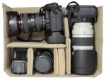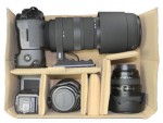 Trotz des kompakten Aufbaus der Kameratasche staunt man über das enorme Fassungsvermögen. Der Zugriff erfolgt von oben und verhindert ein Rausfallen der Kameras oder Objektive. So lassen sich in den Fächern, die mit Kunststoffplatten gegen Stöße verstärkt und Industrieflausch überzogen sind, entweder eine große Profi-DSLR mit vier weiteren Objektiven und Zubehör unterbringen. Dabei darf das aufgesetzte Kameraobjektiv eine Länge von 365 Millimetern besitzen oder man bringt zwei Spiegelreflexkameras mit angesetzten Standardzoom-Objektiven (20 bis 200 Millimeter) mit zwei weiteren Objektiven unter. Optional lassen sich an der Frontseite eine Notebooktasche, Trinkflaschen oder zwei Außentaschen anbringen.