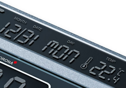 Die Korona zeigt auf ihrem Display nicht nur, wie der überwiegende Teil der Personenwaagen, das Körpergewicht des Benutzers an. Darüber hinaus erfährt dieser von dem von Korona hergestellten Gerät, welche Stunde an welchem Tag es gerade geschlagen hat und wie es um die aktuelle Temperatur bestellt ist.
