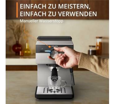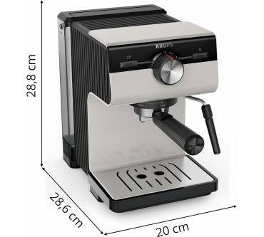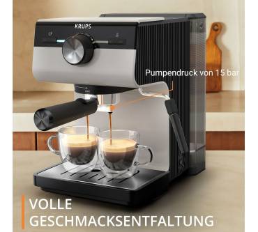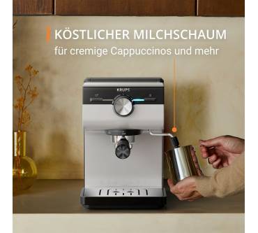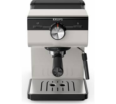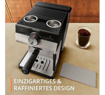 Kleine, kompakte Siebträgermaschine von Krups für Küchen mit wenig Platz. Ideal für den Einstieg, um Espresso zu genießen. Die Bedienung ist auf das Wesentliche reduziert: einfache Bedienknöpfe, Dampflanze für Milchschaum. Die Optik ist schick und schlicht; die Materialanmutung laut Meinungen gefällig, aber doch aus viel Kunststoff hergestellt, was preisbedingt kein Nachteil sein muss.