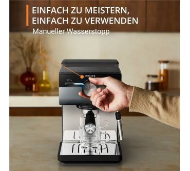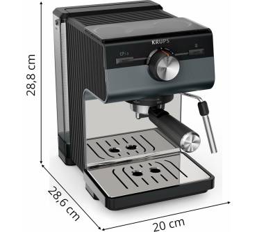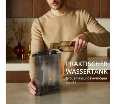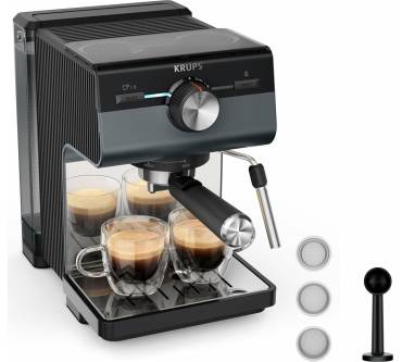 Die Krups Authentic+ XP384G passt mit ihren kompakten Abmessungen gut in kleine Haushalte. Sie hat kein Mahlwerk zum frischen Mahlen von Kaffeebohnen, dafür aber einen sehr großen Wassertank mit zwei Litern Kapazität.