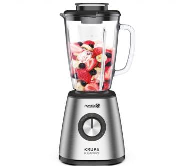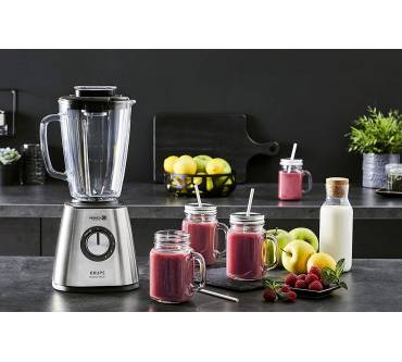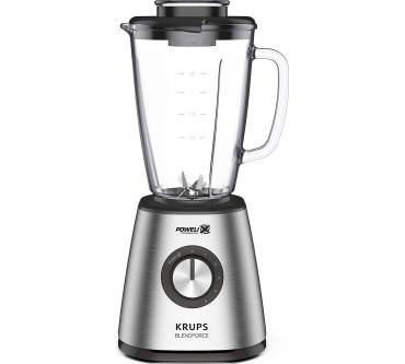 Der Standmixer Blendforce + KB439 von Krups verspricht mit erfreulichen Eigenschaften eine zuverlässige Zerkleinerung von zahlreichen Lebensmitteln. Er arbeitet mit sechs Klingen und einer Leistung von 800 Watt. Damit dürften Sie selbst harte Obst- und Gemüsesorten sowie Eis kleinkriegen. Der Mixbehälter besteht aus Glas. Das ist ein Pluspunkt für die Hygiene – nichts färbt ab oder hinterlässt Gerüche, wie es bei Kunststoff der Fall sein kann. Er fasst 1,75 Liter. Darin bereiten Sie Shakes, Suppe und Co. für circa vier bis fünf Personen zu. Die Mixleistung lässt sich in fünf Stufen justieren und damit an den jeweiligen Mixjob anpassen. Insgesamt erhalten Sie hier eine gute Leistung zum moderaten Preis von rund 70 Euro. Das ist eine Kaufempfehlung Wert.