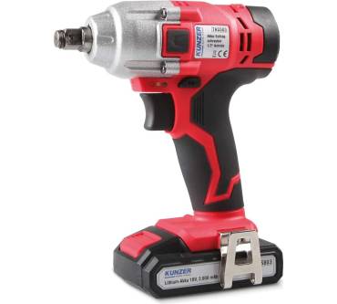 Der Akku-Schlagschrauber von Kunzer ist mit einem Gewicht von unter 1,4 Kilogramm inklusive Akku angenehm leicht. Ebenfalls positiv auf die Handlingeigenschaften wirken sich die Softgrip-Einlagen im Griffbereich aus. Der Kunzer stellt ein Drehmoment von bis zu 320 Newtonmeter bereit, Sie können ihn bedenkenlos zum saisonalen Reifenwechsel an Ihren Kraftfahrzeugen einplanen. Das Getriebe ist stufenlos, die Voreinstellung der benötigten Geräteleistung ist nicht möglich. Sind die Lichtverhältnisse schlecht, erleichtert Ihnen das integrierte LED-Licht die Arbeit. Ein Gürtelclip hält das Einhandgerät nach Arbeitspausen schnell griffbereit. Die Werkzeugaufnahme besteht aus einem Halbzoll-Außenvierkant. Geliefert wird der Schrauber inklusive Netzteil und 2-Amperestunden-Akku, wobei die Ladedauer mit 1,5 Stunden unerfreulich lang ausfällt. Geliefert wird das Set in einem Hartschalen-Transportkoffer.