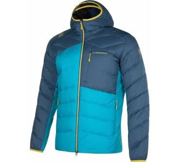 Für das Obermaterial des Daunenjackets Titan hat La Sportiva zum großen Teil recycelte Materialien verwendet. Als Füllung dient eine Mischung aus 90 Prozent Daunen und 10 Prozent Federn. Damit isoliert die Jacke nach Ansicht der Tester von outdoor gut, aber nicht sehr gut. Ob die Daunen von nachweislich artgerecht gehaltenen Vögeln stammen, gibt der Hersteller leider nicht an. Die Ausstattung an Taschen ist überdurchschnittlich. Die Jacke hat neben zwei seitlichen Außentaschen mit Reißverschlüssen noch eine Brusttasche und eine Innentasche. Die Kapuze ist für besseren Sitz mit elastischem Band eingefasst. Außerdem kann sie individuell reguliert werden. Die Titan wiegt in mittlerer Größe rund 545 Gramm. Damit gehört sie nicht zu den leichteste Daunenjacken.