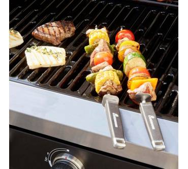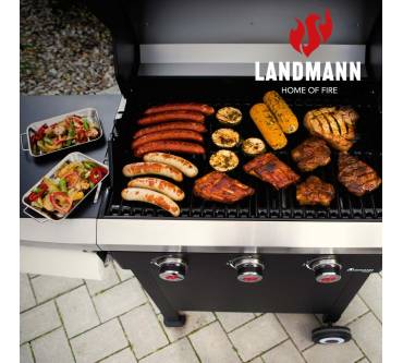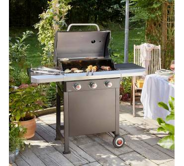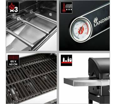 Der Gasgrill von Landmann ist ausreichend groß, um mit der Familie oder Freunden gelungene Grillabende im Garten, auf der Terrasse oder dem Balkon zu genießen. Drei unabhängig voneinander regulierbare Hauptbrenner ermöglichen Ihnen die Zubereitung Ihrer Speisen in unterschiedlichen Temperaturzonen bei direkter oder indirekter Hitze. Gezündet werden die Brenner elektronisch. Die Grillhaube ist doppelwandig ausgeführt, um die Temperatur während des Grillens zu halten. In die Haube integriert ist ein Grillthermometer. Gegrillt wird auf einem zweigeteilten, emaillierten Rost. Ihr Zubehör bringen Sie auf den beiden Seitenablagen unter. Beim Umstellen des Grills unterstützen Sie die beiden einfachen Laufrollen aus Kunststoff.