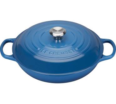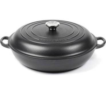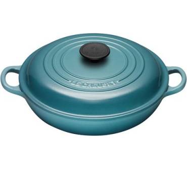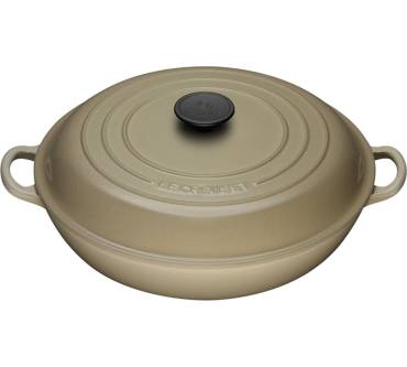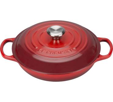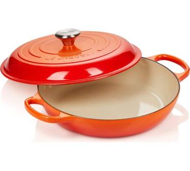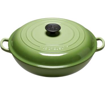 Dabei vertreile der Franzose die Wärme gleichmäßig bis in Rand und Deckel, weshalb das Gargut bei geringer Hitze fortgaren könne und selbst langes Schmoren nur einen geringen Energieverbrauch erzeuge. Vorteile hat dies auch für die Gesundheit: Man schont man Vitamine von empfindlichen Gemüsen, insbesondere auch dank des gut schließenden Deckels. Geeignet ist er für alle Herdarten einschließlich Induktionskochen, trotz Kunststoffknauf im Deckel soll Backofenhitze bis 190 Grad Celsius vertagen werden, und sogar Überbacken oder Grillen ist möglich. Sicherlich sei er etwas größer als Standardkochplatten, doch so könne man ein paar Hühnerschlegel mehr aneinanderschieben, wie ein Amazon-Rezensent schreibt.
