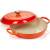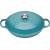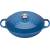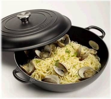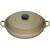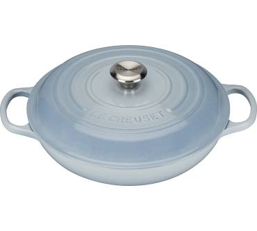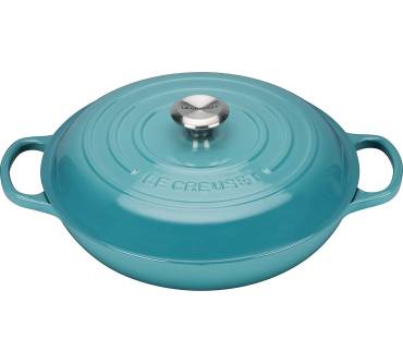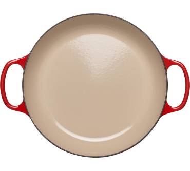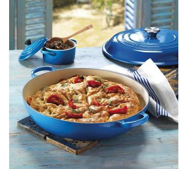 Dabei handelt es sich um einen Gusseisen-Bräter im traditionellen Stil – eher flach, schwer und mit einem gut schließenden Deckel, doch mit einer etwas ungewöhnlichen Bodendurchmesser von 30 Zentimeter. Ebenfalls außergewöhnlich erscheint das im Inneren sandfarbene und außen farbig emaillierte Finish. Damit folgt der Traditionshersteller aus Frankreich dem aktuellen Trend zum farbigen Kochgeschirr, mit dem Kochen und Servieren gleichermaßen gut aussehen sollen. Der Kunde hat die Wahl zwischen teils kräftigen Farben, zum Beispiel Marseille Bleu, Ofen- oder Kirschrot, Rosmarin, Mandarin oder Stone.… und zum Braten, Backen und Grillen geeignet