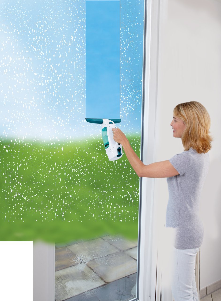 Nicht nur bei hohen Fenstern raubt zugleich eine weitere Schwierigkeit vielen die Nerven und lässt dementsprechend das Fensterputzen zu einer tendenziell eher verhassten und daher möglichst zu vermeidenden Angelegenheit werden. Wird nämlich das mit einem herkömmlichen Fensterputzer aufgetragen Putzwasser nicht sorgfältig genug abgewischt, bilden sich sofort unschöne Streifen. Das Abwischen erfordert daher Übung, und sofern bei dieser Aktion auch noch Überkopf gearbeitet werden muss wie es an hohen Fensterfronten üblich ist, potenziert sich das Problem. Abhilfe verschafft der Leifheit. Er saugt das verschmutzte Wasser nämlich sofort mit beziehungsweise unmittelbar nach dem Einwaschen auf – ein unschätzbarer Vorteil bei hohen Fenstern, aber auch im Wohnzimmer, wenn etwa der Boden möglichst keine Wasserspritzer oder Tropfen abbekommen soll. Die Gummilippe des Saugers eignet sich übrigens nicht nur für Fenster, sondern für alle glatte Flächen, also auch für Kacheln oder die Duschkabine. Mit dem Leifheit kann daher zum Beispiel das komplette Bad zügig und streifenfrei gereinigt werden. Massenhaft viel Zeit steht dafür allerdings nicht zur Verfügung. Denn der Akku des Leifheit soll laut Hersteller lediglich rund 30 Minuten durchhalten. Zum Lieferumfang gehört ein Stiel mit einer Länge von 43 Zentimetern, der per Click-System im Handumdrehen angebracht ist. Der Hersteller hat jedoch noch weitere Stiele in Teleskopform in petto, die für eine größere Reichweite des Saugers sorgen.