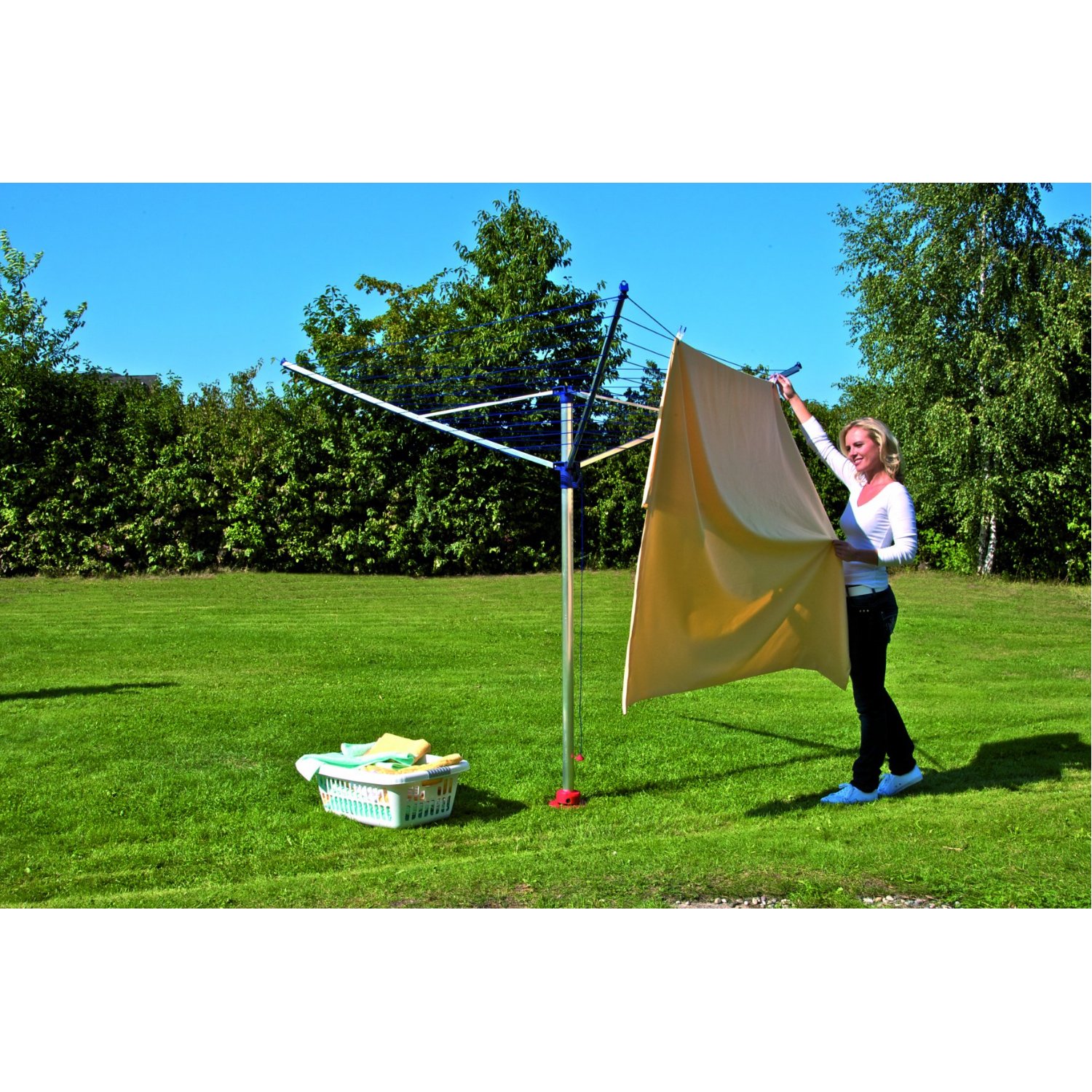 Doch auch die etwas weiter innen gelegenen Leinen fallen im Vergleich zu den anderen Wäschespinnen des Herstellers, die wie gewohnt einen quadratischen Grundriss aufweisen, bedeutend länger aus. So kommen insgesamt neun Leinen zusammen, die am Stück mindestens 2 Meter lang sind – Platz genug also, um in einem Rutsch die gesamte Bettwäsche einer größeren Familie waschen und zum Trocknen aufhängen zu können. Insgesamt wiederum stehen 46 Meter Leinenlänge zur Verfügung, die es, wie auch in Erfahrungsberichten von Kunden bestätigt wird, locker zwei, je nach Trommelgröße sogar mehr Waschmaschinenfüllungen aufnehmen können. Separate Halter an den Tragarmen sind dafür gedacht, zusätzlich mit zum Beispiel Hemden auf Kleiderbügeln bestückt zu werden. Die Wäschespinne selbst schließlich lässt sich mit der Leifheit-typischen Aufspanntechnik kinderleicht öffnen, wobei die Spinne automatisch Einraster, sodass sich die leiden nicht ineinander verheddern können. Im Unterschied zu den neueren Linomatic-Modellen des Hersteller, etwa der Linomatic 500 Deluxe oder der Linomatik 600 Deluxe, verschwinden sie beim Zusammenklappen der Spinne jedoch nicht in den Tragarmen. Als Ersatz dafür wird die Linotrend mit einer Schutzhülle ausgeliefert, die über die Wäschespinne gezogen wird, um die Leinen vor Wind und Wetter zu schützen. Befestigt wiederum wird die Spinne mittels einer Bodenhülse, die ebenfalls zum Lieferumfang gehört.