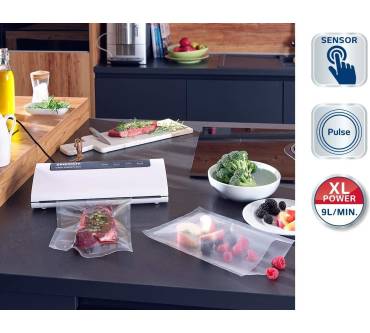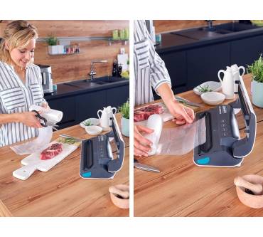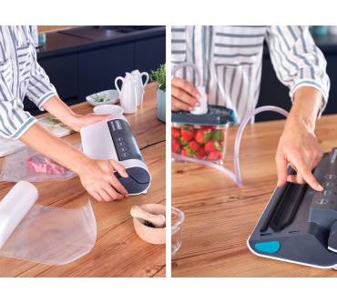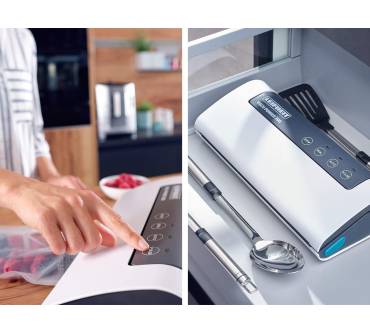 Der Vakuumierer Vacu Power 300 von Leifheit bietet für den gelegentlichen Gebrauch zu Hause eine ansehnliche Leistung. Mit 110 Watt bietet er eine Vakuumierleistung von neun Litern pro Minute. Das ist im unteren Bereich. Nutzen Sie das Gerät jedoch nur hin und wieder, reicht sie prinzipiell aus. Praktisch und ein Plus für die Sicherheit ist die automatisch aktivierte doppelte Schweißnaht: Sie verhindert, dass Luft aus dem vakuumierten Beutel entweichen kann. Die Bedienung erfolgt über ein Touch-Display, das mit einfach zu erfassenden Symbolen simpel zu betätigen sein dürfte. Mit optional erhältlichem Zubehör können Sie mit dem Vacu Power 300 auch Behälter luftdicht versiegeln. Sie zahlen für den Leifheit-Vakuumierer um die 80 Euro. Das ist ein angemessener Preis. Eine höhere Leistung pro Minute bietet der Leifheit Vacu Power 500.