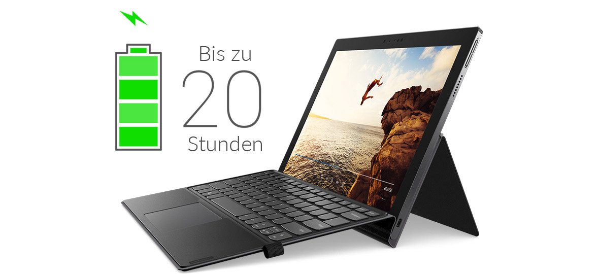Ganze 20 Stunden sind es zwar auch nur bei arg reduzierter Helligkeit, doch die Ausdauer des Miix 630 ist trotzdem beeindruckend (Bildquelle: lenovo.com)