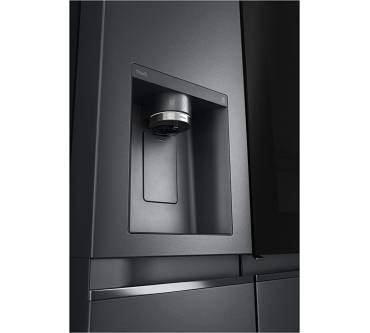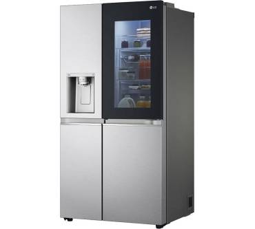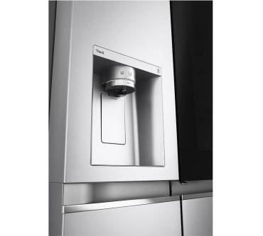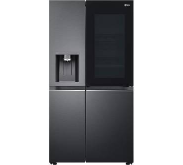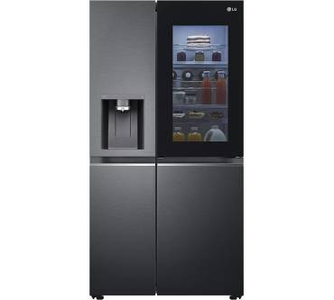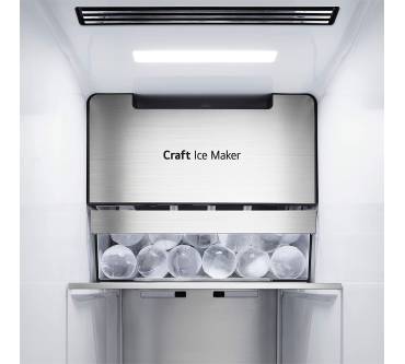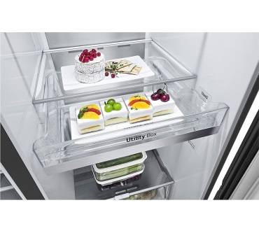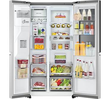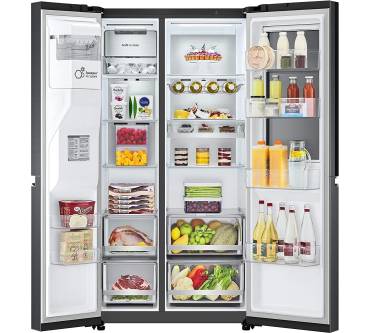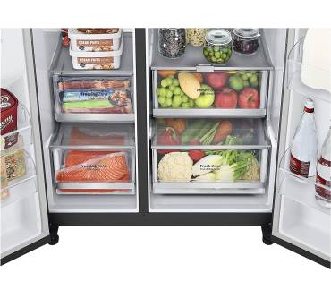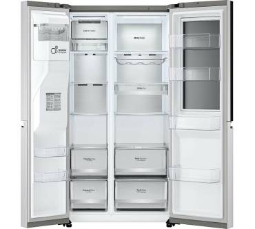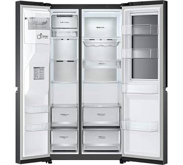 Der Side-by-Side-Kühlschank von LG bietet mit einem Volumen von 635 Liter ein großzügiges Platzangebot und darüber hinaus viel moderne Haushaltstechnik. Der obere Teil des Kühlbereichs ist mit einer Glastür versehen, die sich separat öffnen lässt. Klopfen Sie an diese Tür, schaltet sich zudem die LED-Beleuchtung des Innenraums ein. Für die besonders lange Haltbarkeit Ihrer Lebensmittel soll neben der Umluftkühlung ein zusätzlicher Luftstrom sorgen, der speziell den Türbereich kühlt. Eine der beiden Gemüseschubladen im Kühlteil ermöglicht Ihnen die lebensmittelgerechte Regulierung der Luftfeuchte. Gesteuert wird der LG über ein innenliegendes Touch-Panel mit Temperaturanzeige. Die Steuerung über Ihr Smartphone oder einen Sprachassistenten ist ebenfalls möglich. Ein besonderes Highlight stellen die Möglichkeiten zur Eisbereitung dar. Von außen zugänglich ist ein Eisbereiter, der Sie mit Eiswürfeln, Crushed-Eis und kaltem Wasser versorgt. Im Gefrierteil verrichtet eine zusätzliche Einheit ihre Arbeit, die große, langsam schmelzende Eiskugeln bereitstellt. Zum Betrieb des Eisbereiters ist der Anschluss an das Wasserleitungsnetz notwendig. Das Küchengroßgerät ist in mattschwarz und gebürsteter Stahloptik erhältlich.