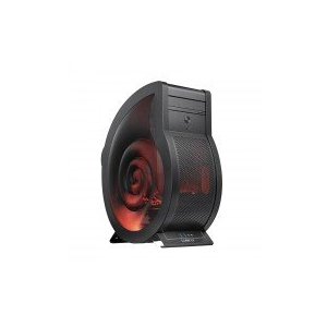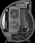 Vorderseitig wurden in den Standfuß die externen Anschlüsse installiert, die als HD-Audio, 2x USB 3.0 und eSATA die Peripherie-Geräte anbinden. Im Kopfbereich der Front kann ein 5,25 Zoll Laufwerk untergebracht werden – die Montage erfolgt ohne Werkzeug. Fast alle Komponenten, außer den Festplatten, lassen sich mit den angenehmen Rändelschrauben fixieren. Die Mainboard-Platte ist für Micro-ATX und Mini-ITX ausgelegt und besitzt einen großen Ausschnitt zur Montage einer Kühler-Backplate, damit das Mainboard nicht extra ausgebaut werden muss. Da die Innenmaße gewisse Einschränkungen bei der Auswahl der Grafikkarte auferlegen, sollten man beim Kauf darauf achten, dass diese nicht länger als 31 Zentimeter ist. Zwischen der Hauptplatine und dem Netzteil werden die Festplatten untergbracht. Es sind Halterungen für drei 3,5 Zoll und zwei 2,5 Zoll große Platten vorhanden und für die Verschraubung sind dämpfende Gummiringe im Lieferumfang enthalten.