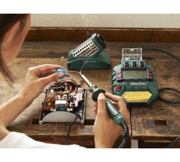 Bei der Lötstation von Parkside handelt es sich um eine kompakte Produktvariante, die auf gelegentliche Arbeiten an Platinen und anderen elektronischen Bauteilen ausgelegt ist. Bei Ihren Lötarbeiten können Sie aus drei unterschiedlichen Lötspitzen wählen, die mittels Gewinde am Lötkolben befestigt werden. Die Basisstation versorgt Sie dank des integrierten Displays mit Daten über die aktuellen Temperaturverhältnisse und den Fortschritt der Aufheizphase. Löten können Sie im Temperaturbereich zwischen 200 und 450 Grad Celsius. Zur Ablage des Lötkolbens während der Arbeitspausen dient ein separater Halter mit Schutzkäfig, den Sie gemäß Ihrer individuellen Vorlieben am Arbeitsplatz positionieren können.