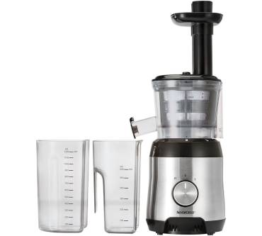 Der Slow Juicer SSJ 300 B3 von Silvercrest (erhältlich via Lidl) ist im Einsteigerbereich anzusiedeln. Der Krug fasst 600 Milliliter, was das Gerät für kleine bis mittelgroße Haushalte interessant macht. Die Verarbeitung des Korpus könnte höherwertiger sein; im Test wirkten die – immerhin spülmaschinenfesten – Teile eher günstig und der Zusammenbau war erschwert. Das ändert jedoch nichts an der insgesamt guten Leistung. Der Entsafter punktet durch eine hohe Ausbeute bei fast allen Obst- und Gemüsesorten. Lediglich aus Spinat holte er weniger heraus. Für den Job benötigt er allerdings seine Zeit. Tomatensaft landete nach fast 2,5 Minuten im Krug – im Vergleich ist das viel. Ein interessantes Feature ist der beiliegende Sorbet-Einsatz, der den Funktionsumfang maximiert. Insgesamt kommt der Kauf für einen Preis von rund 70 Euro infrage, sofern Sie das Gerät für den gelegentlichen Einsatz anschaffen.