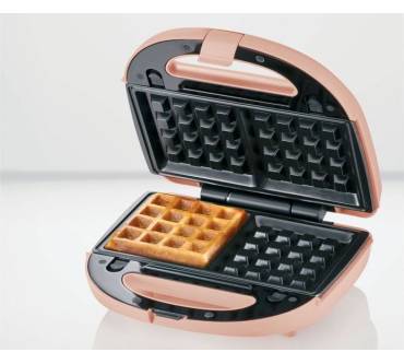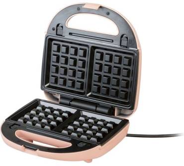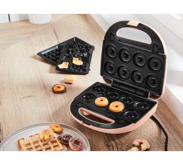 Das Waffeleisen von Lidl ist sehr schlicht gehalten, verfügt aber über drei Wechselplatten, sodass Sie für jeden Anlass frische Waffeln in Tierform, als Minidonuts oder klassisch in belgischer Variante herstellen können. Für den Preis können Sie allerdings kein Premiummodell erwarten. So zeigen sich Abstriche in der Verarbeitung, des verwendeten Außenmaterials und in der Ausstattung. Das Waffeleisen besitzt weder eine Temperatureinstellung noch einen separaten Einschaltknopf. Das Gehäuse ist aus Plastik und teils nicht sehr ordentlich verarbeitet. Die Betriebsanzeige ist der einzige Hinweis, dass das Gerät eingeschaltet ist und aufheizt (rot), sobald es an Strom angeschlossen wird. Mit der grünen Leuchtdiode wird angezeigt, dass die richtige Temperatur erreicht ist, um den Waffelteig in die Form zu geben. Somit ist die Bedienung sehr einfach. Das Wechseln der Einsätze soll laut Lidl ebenfalls leicht von der Hand gehen. Dank Antihaftbeschichtung und herausnehmbarer Einsätze ist die Reinigung auf jeden Fall angenehmer als bei einem herkömmlichen Waffeleisen ohne Wechselplatten. Wenn Sie das Waffeleisen nicht täglich im Dauereinsatz haben, wird es sicherlich ein paar Jahre gute Dienste leisten können.