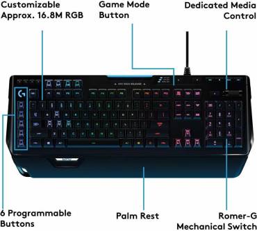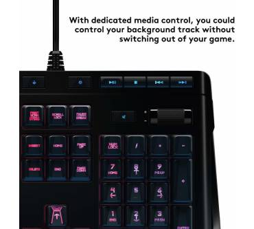 Die Logitech G910 Orion Spectrum ist eine vollausgestattete Gaming-Tastatur mit mechanischen Tasten, die sich an anspruchsvolle Spieler richtet, die idealerweise bereits andere Peripherie von Logitech besitzen. Denn die G910 kommt mit einer synchronisierbaren RGB-Beleuchtung, die mittels Logitech-Software im Einklang mit Ihrer Logitech Maus oder einem Logitech Headset leuchten kann. Logitech hat eigens produzierte Romer-G-Tactile-Switches verbaut, die sich in Schaltcharakteristik den Cherry MX Brown Schaltern ähneln. Sie sind taktil, besitzen also einen spürbaren Auslösepunkt ohne hörbaren Klick. Das ist ein Segen für Ihre Mitmenschen, wenn Sie mit der Logitech auch tippen möchten. Stark: Die Logitech hat dedizierte Makro-Tasten – und zwar neun Stück an der Zahl. Damit wird Ihnen eine enorm hohe Flexibilität geboten, denn Sie können jede der Tasten mit einer eigenen Makro-Abfolge versehen. Die G910 Orion Spectrum wird mit einer Handballenauflage geliefert. Das erhöht den Komfort bei langen Spielesessions enorm.
