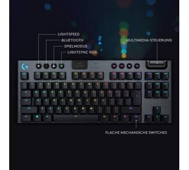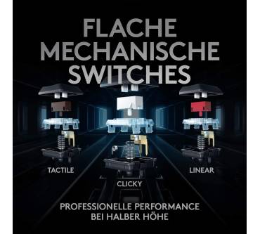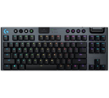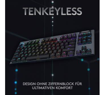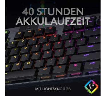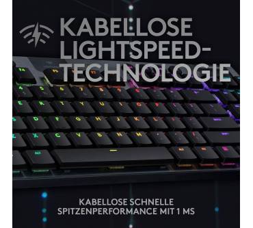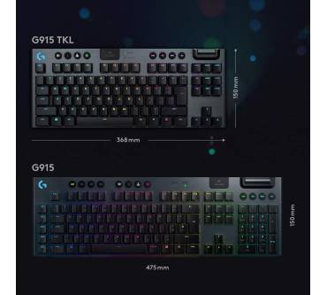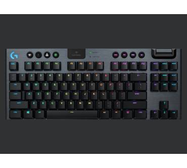Mitt der G915 bringt Logitech eine luxuriös ausgestattete und besonders kompakte kabellose Tastatur auf den Markt. Platz wurde durch das Weglassen des Ziffernblocks gespart; das Haupt-Tastenfeld bleibt hingegen im Standard-Layout mit komfortablen Tastenabständen. Die Tastatur ist mit verschiedenen mechanischen Schaltern erhältlich, wobei sich die weißen Schalter für Vieltipper anbieten. Diese sind allerdings auch sehr laut und somit nichts für gemeinschaftliches Arbeiten im Büro. Mangels Handballenablage ist die G915 TKL ohnehin für längere Sessions nicht empfehlenswert. Die umfangreich konfigurierbare RGB-Beleuchtung soll Gaming-Enthusiasten locken. Diese Zielgruppe profitiert auch von dem Funkstandard Lightspeed, der eine sehr schnelle Signalübertragung garantiert. Alternativ zu Lightspeed mit USB-Dongle kann das Tastenbrett auch per Bluetooth mit Geräten verbunden werden. Per Tastendruck wechseln Sie zwischen verschiedenen verbundenen Endgeräten. Der Akku ist fest integriert und lässt sich einfach per Mikro-USB-Kabel aufladen.