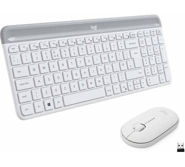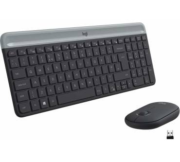 Das Logitech MK470 Slim Combo ist ein kabelloses Set bestehend aus einer flachen Tastatur sowie einer sehr einfach ausgestatteten Maus. Die Tastatur folgt dem oft kopierten Tasten-Design der Apple Magic Keyboard und ist wahlweise in Schwarz oder Weiß erhältlich. Die Tastatur wird mit zwei AAA-Batterien versorgt und hält bei gewöhnlicher Nutzung mindestens zwei Jahre, so der Hersteller. Verbunden werden Maus und Tastatur mittels Funk, für den Sie einen freien USB-Steckplatz für den USB-Dongle benötigen. Die Tasten sind besonders leise, sodass Sie im Büro auch als Vieltipper stets eine angenehme akustische Atmosphäre genießen können. Für den täglichen Büroeinsatz eignet sich die Tastatur allerdings weniger, da Sie aufgrund der flachen Bauweise ohne Handballenauflagen schnell für Handgelenksprobleme sorgen kann – hier geht Design vor Ergonomie.