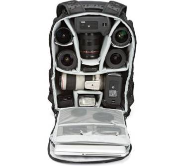 Der Lowepro ProTactic 450 AW ist ganz auf die Anforderungen und Wünsche professioneller Fotografen zugeschnitten. Er bietet ausreichend Platz für zwei Kameragehäuse, wobei eine auch mit einem angestecktem 70-200 Millimeter Teleobjektiv gut Platz findet. Für die zweite wird es allerdings mit Teleobjektiv zu eng. Insgesamt passen in diesen Rucksack aber bis zu acht Objektive oder ein Blitz sowie jede Menge Zubehör. Ein Laptop bis 15 Zoll kann gut geschützt in dem Fach auf der Rückseite verstaut werden. Bei den Außenmaßen wurde berücksichtigt, dass der ProTactic im Handgepäck mitreisen kann.