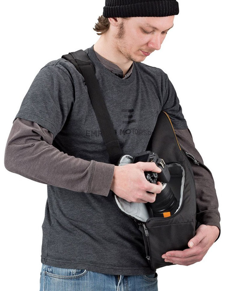 In der Slingshot Edge 250 AW lassen sich eine mittelgroße DSLR mit angesetztem Objektiv, ein weiteres Objektiv sowie ein kompakter Blitz verstauen. Als Slingtasche kombiniert sie die Vorteile, von Rucksack und Schultertasche: Sie kann bequem auf dem Rücken getragen werden, bietet gleichzeitig jedoch schnellen Zugriff auf das Ausrüstungsfach, ohne dass sie abgesetzt werden muss.