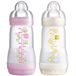 Weil Babys beim Trinken an der Flasche oft viel Luft schlucken, haben Hersteller von Babyflaschen verschiedene Konzepte mit Zusatznutzen entwickelt. Bei Mam ist das ein Bodenventil, das mit Ventilationslöchern für Unterdruckausgleich beim Trinken sorgt. Damit fließt die Milch gleichmäßig und im Übrigen ohne Luftblasen und Aufschäumen. Die Anti-Colic besteht aus Bodenventil, Flasche, Saugeraufsatz, Sauger, und Schutzkappe. Der Sauger wiederum ist besonders weich – ein Material, das hautähnlich sein soll und damit die Annahme des Saugers beim Baby fördert. Einen Vorteil stellt dies natürlich auch für die Kombination aus Stillen und Flaschenernährung dar. Wenn Trinken an Brust und Flasche sich ähnlich sind, fällt der Wechsel von Brust zur Flasche und umgekehrt leichter – ein Faktor, der bei manchen Müttern zur Verlängerung der Stillzeit geführt hat.Weicher, aber auch formstabiler Sauger?