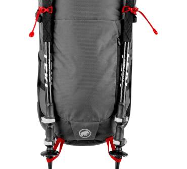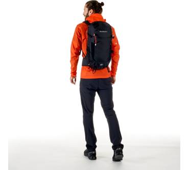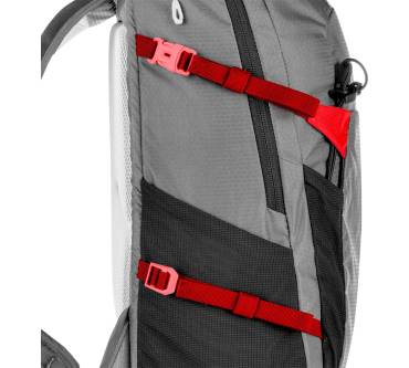 Der Lithium Zip von Mammut eignet sich mit einem Volumen von 24 Litern für Kurzausflüge und Tageswanderungen. Durch das robuste und widerstandsfähige Material ist er gut für den Outdoor-Einsatz in alpinem Gelände gewappnet. Verwendet wurde Nylon in zwei Stärken. Obwohl der Lithium Zip vergleichsweise klein ist, präsentiert er sich mit einem guten Platzangebot. Neben dem großen Hauptfach gibt zwei Seitentaschen aus Netzgewebe an den Seiten, eine Tasche aus Stretchmaterial und eine Reißverschlusstasche vorn sowie weitere Taschen am Hüft- und an einem Schultergurt. Zudem können Trekkingstöcke an dafür vorgesehenen Halterungen befestigt werden. Um Schulter- und Rückenbeschwerden bei längerem Tragen zu vermeiden, verfügt der Rucksack über ein spezielles Tragesystem. Die Rückenpartie und die Gurte sind gepolstert.