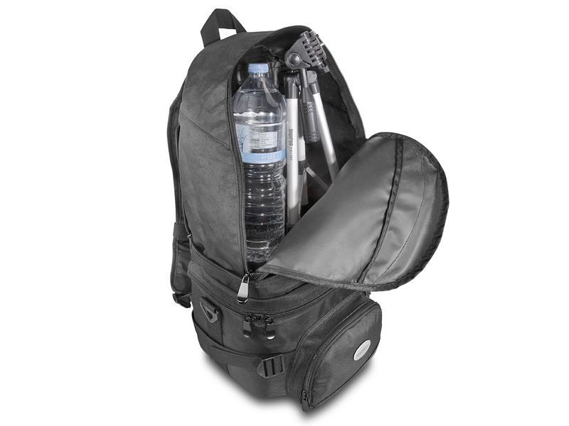 Der Mantona Turmalin sieht sehr sportlich und gleichzeitig elegant aus und hinterlässt einen angenehmen optischen Eindruck. Mit Abmessungen von 17 x 25 x 16 Zentimetern bietet das Modell als Fototasche Platz für eine mittelgroße SLR-Kamera mit angesetztem Objektiv plus ein Blitz- beziehungsweise Ladegerät. Viel mehr passt jedoch in die Tasche hinein, wenn die spezielle Erweiterung aus dem Deckel herausgezogen wird. Als Fotorucksack ist der Mantona Turmalin nämlich von außen 52 x 28 x 25 Zentimeter groß und erlaubt es sogar, ein kompaktes Stativ im oberen Fach mitzuführen.