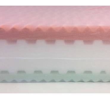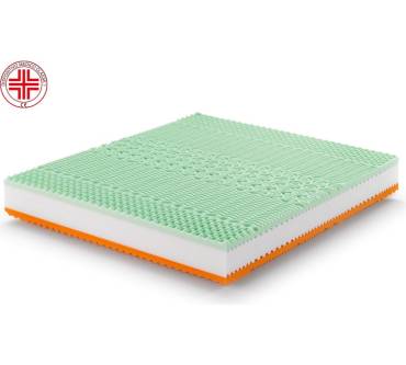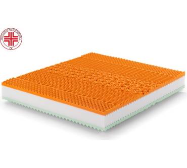 Bei Marcapiuma kommt das Marketing mächtig auf Touren: Die Visco-Matratze Rainbow Plus ist auf der Liegeseite mit „Visco Bio Soia“ ausgestattet, einem in fünf Liegezonen eingeteilten zäh-nachgiebigen Schaum, den Sie vielleicht als Memory- oder Visco-Schaum kennen. Diese oberste, etwa 4 cm dicke, orangefarbene Schicht soll wie eine Massage wirken – was nach einem harten Tag zweifellos die Stimmung heben würde. Was aber aus Käufersicht viel eher für die Schaummatratze spricht, ist die Bequemlichkeit in allen Schlafpositionen, die gemütliche Höhe von 22 cm und die Bezugseigenschaften: per Reißverschluss leicht abnehmbar und bis 60 °C waschbar. Nur die Maße machen Probleme. In vielen Fällen sind die ausgelieferten Matratzen zu lang oder zu breit, passen demnach nicht in die Bettrahmen und, nach dem Waschen, auch nicht mehr richtig in den Bezug.