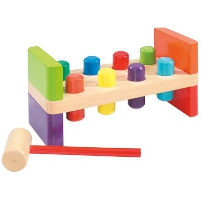 Die Klopfbank von Eichhorn sieht vergleichsweise robust aus: Die acht farbig lackierten Zylinder sind aus Holz gefertigt, die Basis wirkt nicht minder robust und auch der mitgelieferte Holzhammer macht einen soliden Eindruck. In ihren Maßen erreicht sie 22 x 11 x 10 Zentimeter und soll, wie vom Hersteller zu erfahren ist, ihren pädagogischen Nutzwert vor allem bei der Motorikschulung für die Kleinen haben. Das Holzspielzeug richtet sich an Kinder ab einem Jahr, sämtliche Teile sind ohne scharfe Ecken und Kanten oder raue Oberflächen.Widerstand für Holzzylinder suboptimal