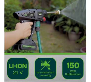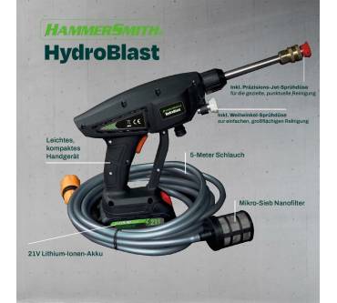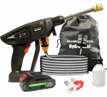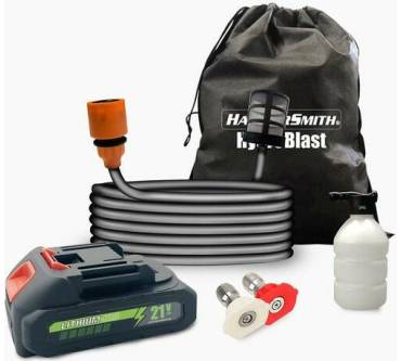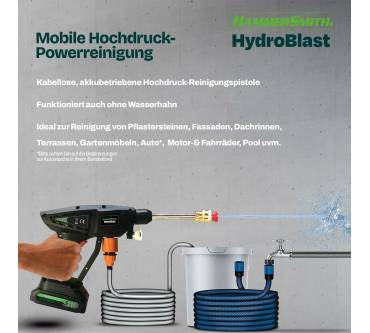 Mit dem Hammersmith HydroBlast - derzeit bei Medisahop.tv bereits unter 60 Euro im Sortiment - können Sie kleinere Reinigungsarbeiten mobil erledigen. Durch die integrierte Selbstansaugung sind als Wasserquelle Eimer oder Regentonne nutzbar, den Strom liefert ein wieder aufladbarer Lithium-Ionen-Akku. Laut Hersteller reicht dieser für bis zu 40 Minuten. Düsen für punktuelle Entfernung hartnäckiger Verschmutzungen oder flächiges Arbeiten sind dabei. Zum einfachen Zuführen von Reinigungsmitteln (beispielsweise bei der Autowäsche) stecken Sie die ebenfalls mitgelieferte Seifenschaumflasche auf. Bescheiden ist der laut Hersteller erzielbare Maximaldruck mit 7 bar, was einige Nutzer beanstanden und dem HydroBlast nicht viel mehr Wirkung als bei einem gängigen Gartenschlauch zuschreiben. Dennoch punktet das Gerät bei knapp der Hälfte der Rezensenten durch seine Mobilität und einfache Handhabung.