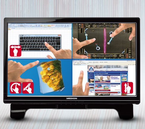 Ab dem 18. März bietet Aldi Nord mit dem Akoya X54000 (MD 20165) des Elektronik-Hoflieferanten Medion seinen ersten multitouchfähigen Monitor an. Der 22. Zöller beherrscht die Kunst, mit den Fingern gesteuert zu werden. Dafür stehen eine Reihe von Gesten parat, die sich mittlerweile auch über die neue Handy-Generation schnell zum Allgemeingut gemausert haben. So kann der Anwender etwa mit Fingergesten Ordner öffnen und verschieben, Bilder / Rahmen vergrößern und drehen sowie in Dokumenten blättern – eine Funktion, die speziell für Arbeiten unter Windows 7 gedacht ist. Für eine genaue Eingabe liegt außerdem noch ein Touchpen dem Lieferumfang bei.