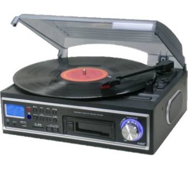 Einen Computer braucht man dank USB-Buchse und eingebautem Kartenleser nicht. Die Musiktitel werden im MP3-Format auf einem per USB angeschlossenen Massenspeicher (Speicherstick, MP3-Player) beziehungsweise auf einer SD-Karte archiviert. Offen bleibt, mit welcher Datenrate die Titel auf dem Speichermedium landen und ob die Datenrate variabel ist. Weil Medion zwei Lautsprecher verbaut hat, die mit einer Ausgangsleistung von jeweils 1,5 Watt belastet werden, kann man seine Musik während der Aufnahme anhören. Alternativ lässt sich der mit einem Kassettendeck bestückte Plattenspieler per Line-Out (Cinch) an eine pegelfeste HiFI-Anlage anschließen. In Sachen Konnektivität stehen außerdem ein 3,5 Millimeter-Kopfhörerausgang sowie ein 3,5 Millimeter-Aux-Eingang für externe Zuspieler bereit. Die ins MP3-Format konvertierten Dateien können per USB oder über den Kartenleser abgespielt werden, natürlich kann man sie auch auf anderen Wiedergabegeräten nutzen. Während der Wiedergabe werden die I3D-Tags der MP3-Dateien, also Informationen zum Album, zum Interpreten und zum Titel, im beleuchteten LC-Display angezeigt – falls man Informationen gespeichert hat. Der Plattenteller wird von einem Riemen angetrieben und bietet zwei Geschwindigkeiten, also 33 1/3 (Langspielplatten) und 45 Umdrehungen in der Minute (Singles). Die bei Schellackplatten üblichen 78 Umdrehungen in der Minute werden nicht unterstützt. Zum Lieferumfang des 30,5 Zentimeter breiten, 7,3 Zentimeter hohen und 25,3 Zentimeter tiefen Plattenspielers gehören eine Staubschutzhaube und eine Fernbedienung.