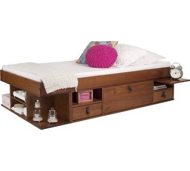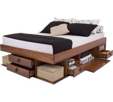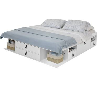 Das Memomad Bali: Ist das ein Bett oder eine Kommode mit integrierter Matratze, eine Art Kombimöbel vielleicht, eventuell sogar ein Stauraum-Sofa? Der Witz bei diesem Möbelstück ist, dass es alle Funktionen gleichzeitig erfüllt. Es verfügt über einen Lattenrost, dazu Schubladen, Regalfächer, ein Fach mit Türe und ein ausziehbares Regalbrett, auf dem Sie Kaffeetassen, Wecker und Lektüre ablegen können. Klar – mit seinem MDF-Platten und Kiefernholzteilen ist es kühl designt und den Ledergriffen zum Trotz kein Highlight in Sachen Möbeldesign. Aber wie so oft prägt der Preis den Charme eines Möbelstücks, das vornehmlich funktional sein will. Das Bali ist zum Sitzen an der Bettkante nicht geeignet, das muss man wissen, und der Lattenrost ist ohne Federwirkung. Wer noch etwas Zeit und Geschick für den Aufbau mitbringt, wird am Bali wenig vermissen. Erhältlich ist es in Weiß und Karamell sowie in verschiedenen Breiten für Allein- und Paarschläfer.