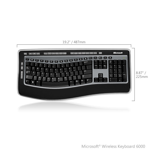 Auf Eleganz setzt das Wireless Keyboard 6000 mit dem leicht durchscheinenden Gehäuse, das entweder eine Anleihe oder eine Hommage an die Desktop-Oberfläche Windows Aero darstellt. Fünf Tasten wiederum können mit favorisierten Anwendungen belegt werden, und die Mediatasten kontrollieren das Musik-Management, inklusive Lautstärkeregelung. Mit der Flip-3D-Taste werden die geöffneten Windows-Fenster dreidimensional angezeigt, so dass man sich „räumlich“ zwischen ihnen hin und her bewegen kann. Die Anzeige des Batteriestatus schließlich bewahrt vor bösen Überraschungen.