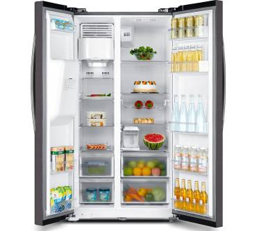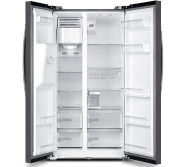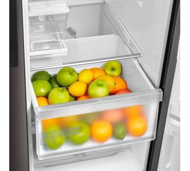 Der Side-by-Side-Kühlschrank von Midea ist für Haushalte interessant, in denen regelmäßig größere Mengen frische Lebensmittel aufbewahrt werden. Im Kühlteil verstauen Sie Ihre Nahrungsmittel in fünf Türfächern und auf vier Glasablagen. Für Obst und Gemüse stehen Ihnen zusätzlich zwei transparente Schubladen zur Verfügung. Sowohl in Kühl- als auch im Gefrierteil sorgt eine LED-Beleuchtung für den Überblick über Ihre gekühlten Vorräte. Das lästige Abtauen im Gefrierteil nimmt Ihnen ein No-Frost-System ab. Die Temperaturen in Kühl- und Gefrierteil regulieren Sie unabhängig voneinander, zwei getrennte Kühlkreisläufe machen das möglich. Die gewünschten Einstellungen nehmen Sie über ein außenliegendes Touch-Panel mit Temperaturanzeige vor. Für Erfrischungen in Form von Eiswürfeln und gekühltem Wasser sorgt ein Eiswürfelspender.
