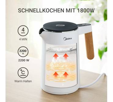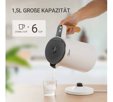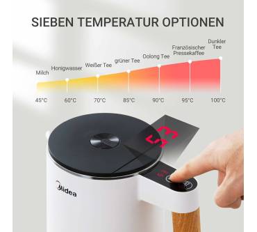 Der Midea MK-HE1533 ist ein 1,5-Liter-Wasserkocher aus Edelstahl mit einer Leistung von 2200 Watt. Er bietet sieben Temperatureinstellungen von 45°C bis 100°C, eine Warmhaltefunktion für bis zu eine Stunde und eine automatische Abschaltung bei Erreichen der gewünschten Temperatur oder bei zu wenig Wasser. Der Wasserkocher verfügt über ein doppelwandiges Gehäuse für erhöhte Sicherheit und einen 360°-drehbaren Sockel für flexible Handhabung. Ein integrierter Kalkfilter sorgt für reines Wasser.